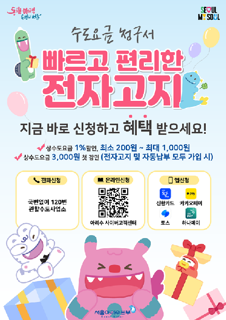또한, 카카오톡에서 '서울아리수본부' 채널을 추가한 뒤 챗봇 '아리수톡'을 통해서도 신청할 수 있으며, 신한카드, 카카오페이, 토스, 하나페이 등 주요 간편 결제 앱에서도 신청이 가능합니다.