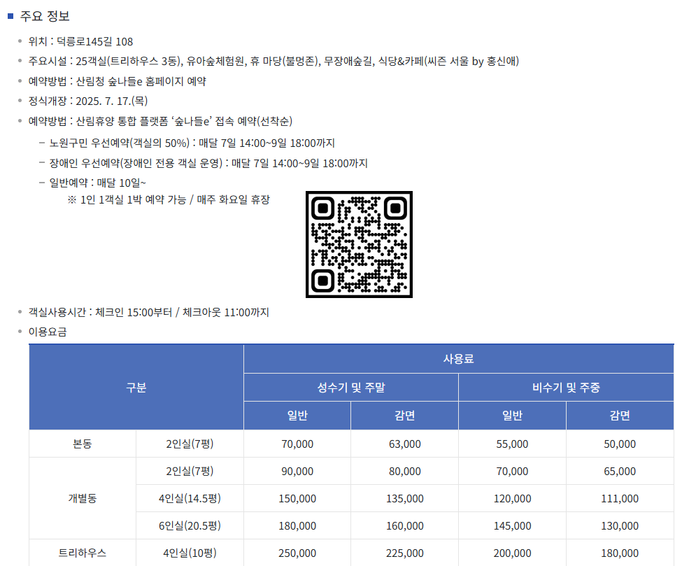 · 성수기(7~8월)에는 선착순 후 ‘추첨’ 방식이 적용되기도 하니 숲나들e 공지사항을 꼼꼼히 확인하세요